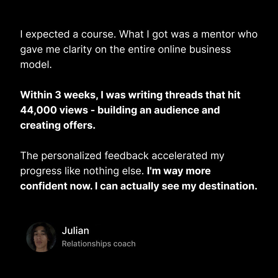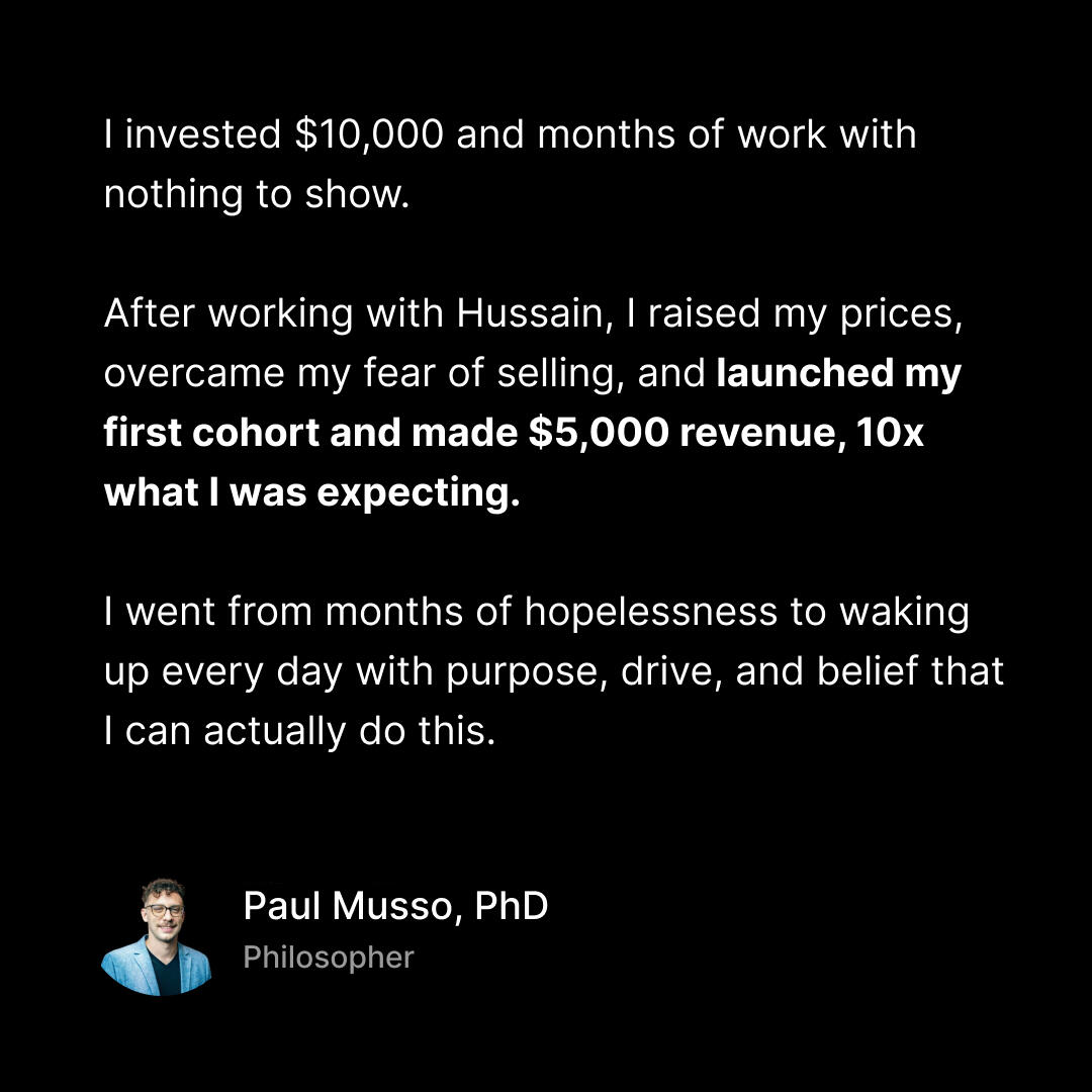 Here's the thing about most personal brand cohorts:They charge $4,000-$7,000 to join a massive group where you're just a number.You rarely get to interact with the creator.You're lucky if you get a response in the community chat.I want to do something different.I want to create a cohort that's more affordable while still giving you the high-touch support you need to succeed.So instead of charging $4,000+ like everyone else.I'm not even charging $3,000 or even $2,000.Which is why I'm keeping this at just $1,000.That's a cup of coffee every day for a year (but this cohort has the potential to make you 5x more money).It's less than the cost of a single course that you'll never finish.Less than what you'd spend on a weekend getaway.And it's a fraction of what I spent ($10,000+) trying to figure this out on my own.Plus, here's the reality:One client pays for this entire cohort.And I'm going to show you how to get 3-5 clients in the first few weeks.So this pays for itself almost immediately.