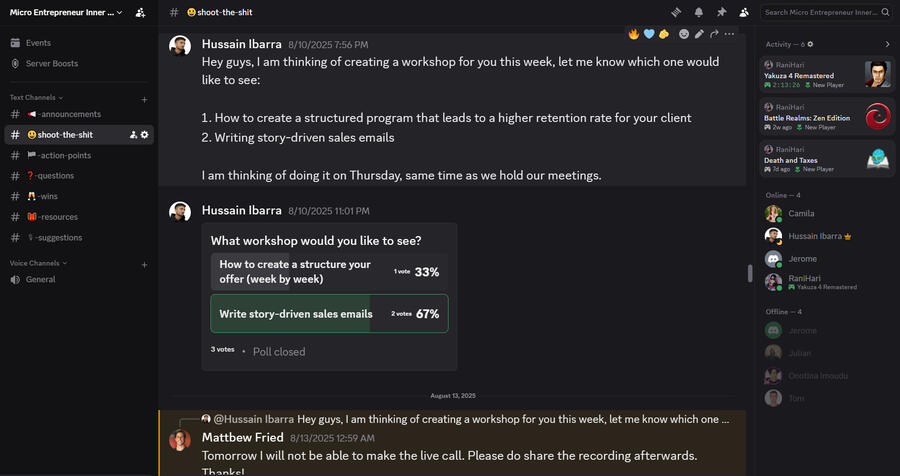 Learn the exact systems behind a 6-figure one-person business. Taught live. No fluff. Each sessions ends with direct feedback and implementation steps.